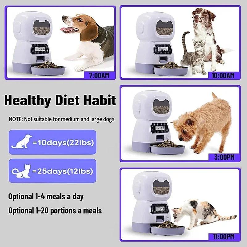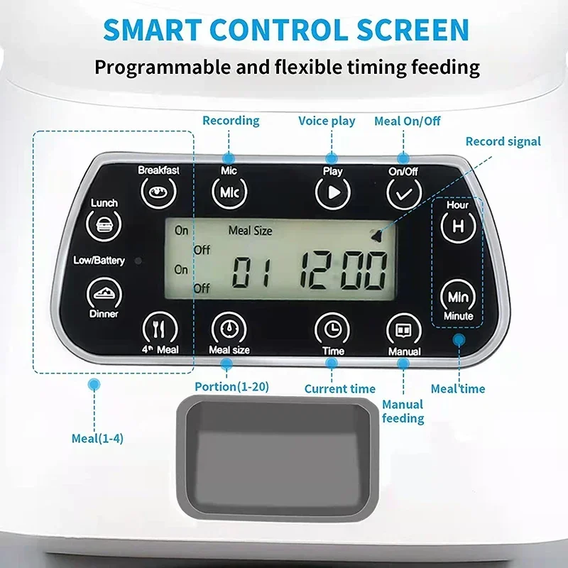 • Customizable Feeding: Set precise portion sizes to match your pet’s dietary needs, promoting a balanced diet and preventing overeating.