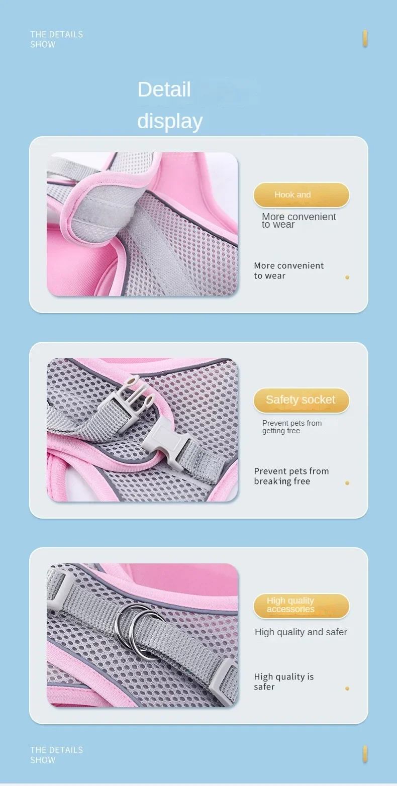 The lightweight, breathable mesh material keeps your pet cool and comfortable, even during warm weather. The vest-style design evenly distributes pressure across your pet's chest, reducing strain on their neck and ensuring a comfortable experience. The adjustable straps provide a customized fit, making this harness ideal for growing pets or those with unique body shapes.